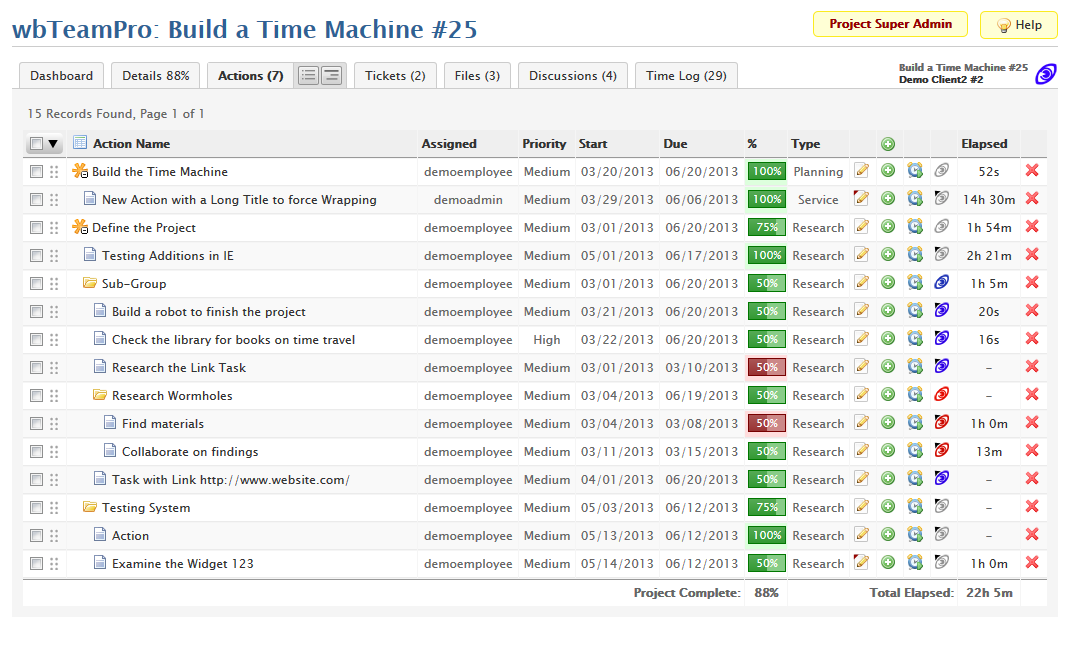 Each project provides a sandbox for team collaboration and asset storage. The File Assets feature of wbTeamPro provides a unique Thread like storage and asset versioning system that allows for tracking of asset changes. The Discussions feature provided with each project provides a common forum style layout for collaboration and idea collection.