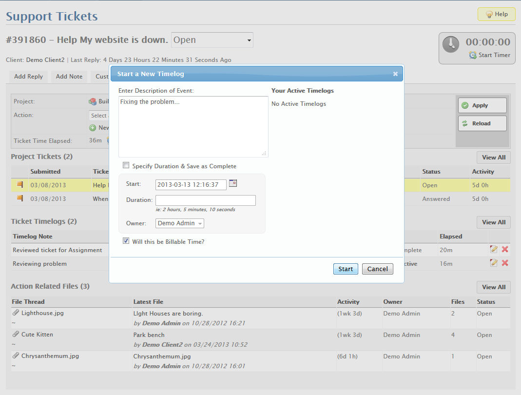 From the standard Ticket dialog wbTeamPro provides a Time log integration, allowing you to monitor the time spent resolving ticket issues. Time log records can be related to a Project or even a specific Action, providing additional metrics for your project.